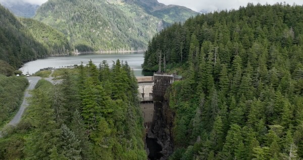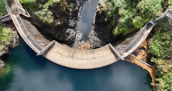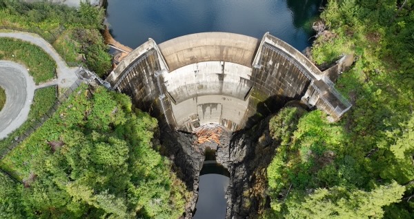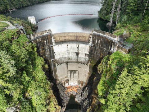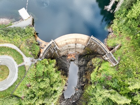 Flight looking down at dam then pans up looking south